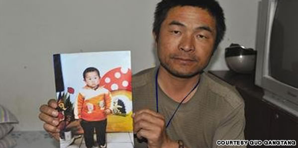 Guo Gangtang holds a photo of the son he has been searching for since 1997.